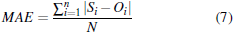 MAE (error absoluto medio) es el promedio de los errores (ecuación 7). El RMSE es mayor que el MAE, por lo que la magnitud de la diferencia indica la bondad del modelo (Alvarado, 2001). Este parámetro se utiliza ampliamente para las evaluaciones de los modelos (Chai y Draxler, 2014). Willmott y Matsuura (2005) consideran que este parámetro es un mejor indicador del error promedio que RMSE. Un modelo con un ajuste perfecto tiene un MAE de 0.