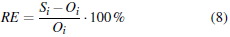 Error relativo (RE) (Ecuación 8), este parámetro representa el error relativo de la predicción tomando como base los datos medidos.