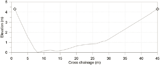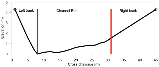 El parámetro de rugosidad en CES se realiza a través de un coeficiente denominado rugosidad unitaria (nl), que tiene las mismas unidades que el coeficiente de Manning. Este coeficiente evalúa los ríos del Reino Unido, donde hay una alta inmersión relativa y una profundidad de agua de 1 metro. Por lo tanto, este parámetro está relacionado únicamente con la disipación de la fricción. Dependiendo de la variación del material del lecho, la vegetación o las irregularidades en el área transversal, es posible determinar las zonas de rugosidad donde se asigna un determinado valor unitario de rugosidad. Por ejemplo, en la figura 3 las líneas rojas indican los límites de las zonas de rugosidad, en donde, por ejemplo, el banco izquierdo y derecho tienen un material de lecho de roca cubierto por vegetación, mientras que el lecho del río cuenta con rocas sin vegetación.