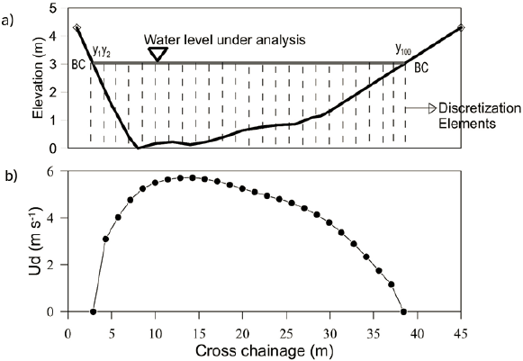 El CES discretiza el ancho de un área transversal a intervalos constantes. La intersección del nivel de agua analizado con la sección transversal se considera como el primer y último elemento. En la Figura 2a, esos elementos son y1 y y100, y el número de elementos tomados por defecto es 100. A continuación, el CES resuelve las ecuaciones promediadas en profundidad (RANS) a través del método de elemento finito (FEM), donde se obtiene el flujo unitario (q) para cada elemento (y1, y2…y100). La selección de q se debe a sus propiedades de continuidad (Knight y col., 2009), y las condiciones límite en los elementos extremos son flujos unitarios iguales a cero. El flujo unitario se transforma entonces en velocidad de flujo promediada en profundidad (Ud en la Figura 2b) para cada elemento. Sin embargo, la distribución de velocidad cruzada no siempre está disponible para la validación del modelo, sino que más bien existe una curva de clasificación que relaciona el flujo con la profundidad del agua. Estos datos son obtenidos por el CES ya que hay una integración de velocidades promedias de profundidad para determinar un flujo promedio para toda el área. El CES repite todo el proceso anterior automáticamente para 25 profundidades, por lo que se obtiene una curva de descarga.