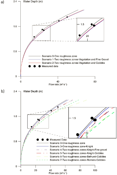 La Figura 4b ilustra la sensibilidad del modelo hacia la selección del modelo de rugosidad. Por ejemplo, en los modelos 6 y 7, los nuevos modelos de rugosidad junto con áreas adicionales de rugosidad no mejoran la predicción de la curva de clasificación, sino que conducen a valores más bajos de altura del agua. Según la Figura 4b, el mejor escenario es el número 3, que utiliza una zona de rugosidad con el modelo de rugosidad de Knight y col. (2009).