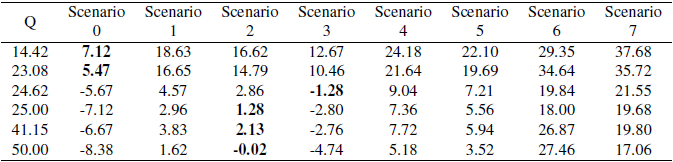 La Tabla 3 presenta los resultados de los índices estadísticos, y las celdas grises muestran el modelo con la coincidencia más cercana al valor óptimo para cada parámetro. El RMSE muestra que el escenario 3 (una zona de rugosidad, modelo de rugosidad de Knight y col. (2009)) es el mejor modelo. Además, el escenario con el menor error medio absoluto (MAE) fue el escenario 2 (dos zonas de rugosidad, descripción de cuenca: empedrado + hierba de altura variable). La magnitud de la diferencia entre estos dos índices muestra que el escenario 3 es el mejor para predecir la curva de clasificación en el río Tomebamba. Los valores EF confirman que los escenarios 2 y 3 son los mejores, con un buen rendimiento (ver Tabla 2). Además, la Tabla 4 presenta el error relativo con respecto a los datos medidos para cada flujo y para cada escenario. Esta tabla muestra que, para los valores de flujo bajo, el escenario 0 tiene menos diferencia con respecto a los datos medidos. Además, en estas magnitudes de flujo, la Tabla 4 representa el error relativo más alto para todos los escenarios. Sin embargo, para valores de flujo más altos, el escenario 2 tiene la diferencia relativa más baja en la mayoría de los datos. Este aspecto coincide con el mayor valor de MAE presentado en la Tabla 3 para el escenario 2.