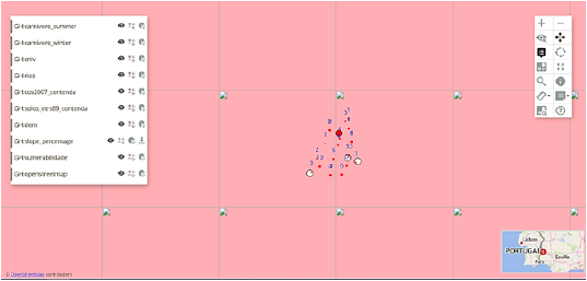 Toda la información utilizada se encuentra en el sistema europeo de coordenadas de referencia terrestre 1989 – Portugal Transverse Mercator 2006 (ETRS89 PTTM06; EPSG: 3763). Con el fin de introducir los datos en los mapas web, todos los temas se proyectaron a WGS84 (sistema Geodésico Mundial 1984) en el programa QGIS. Para cada plugin se evaluaron: i) las ventajas (documentación, biblioteca de código abierto, seguridad, conectividad, entre otros); ii) desventajas (el requisito de programas externos, la existencia de planes de suscripción, entre otros); iii) una comparación detallada entre los plugins considerando si hay planes gratuitos o planes de suscripción, al igual que el límite de los datos (cuando corresponda); iv) las herramientas de visualización y edición presentadas en cada plugin (por ejemplo, zoom in, zoom out, herramientas de medida, coordinación, creación de mapas de calor, herramientas de gestión de datos, entre otros) y; v) una comparación detallada de las funciones generales, como la existencia de tutoriales, el acceso, el almacenamiento, la seguridad, la nube y la aplicación móvil, entre otras funciones.