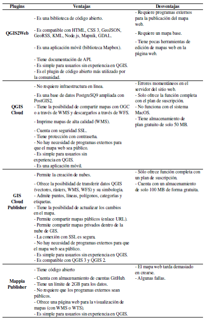 Las Tablas 2-5 comparan los cuatro plugins en varios aspectos: ventajas y desventajas; planes; herramientas de visualización y edición; y funciones generales. La información presentada en estos Tablas ayudará a la toma de decisión del usuario que quiera crear un mapa web usando el software QGIS. En general, los cuatro plugins tienen varias ventajas en términos de acceso al proporcionar tutoriales y soporte en línea, y brindar un conjunto de herramientas de visualización. Algunos de estos plugins ofrecen acceso a los usuarios sin experiencia en QGIS. Esta característica es una ventaja para un usuario nuevo. Los cuatro plugins proporcionan tutoriales y vídeos de ayuda, al igual que herramientas de visualización. Sin embargo, solo GIS Cloud Publisher proporciona herramientas de visualización y edición en el mapa web. En términos de almacenamiento, cada plugin ofrece una variedad de almacenamiento de acuerdo con la función de cada uno. QGIS2Web brinda más almacenamiento que los demás. Mappia Publisher ofrece 2GB de almacenamiento web; GIS Cloud Publisher hasta 100MB almacenamiento gratuito en la nube y puede llegar hasta 1GB si el usuario se suscribe al plan; QGIS Cloud hasta 50MB de almacenamiento gratuito en la nube y puede llegar hasta 1GB si el usuario se suscribe al plan. En términos de seguridad de datos, QGIS Cloud y GIS Cloud Publisher utilizan una conexión SSL segura. Estos plugins ofrecen al usuario seguridad adicional para que nadie pueda acceder a sus mapas web sin permiso. Mappia Publisher utiliza la seguridad proporcionada por la página GitHub y QGIS2Web no consta de ningún plan de seguridad.
