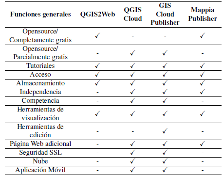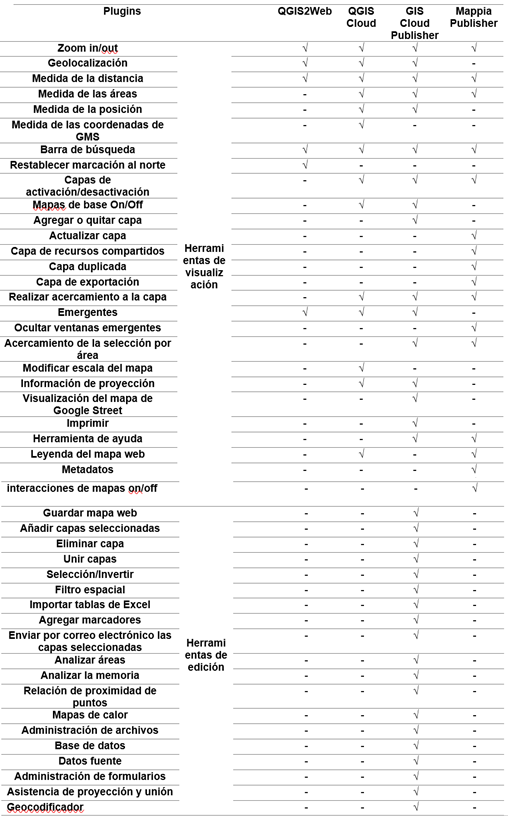 En la Tabla 4 se puede observar que el GIS Cloud Publisher es el único plugin que proporciona herramientas de edición. En el Tabla 5 se presenta un resumen de este análisis comparativo.