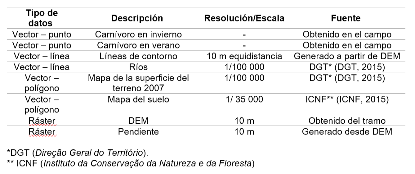 En la Tabla 1 presenta la información relativa al conjunto de datos utilizados en los mapas web creados. Esta información incluye el tipo de datos, la descripción de los datos, la resolución-escala y el origen.