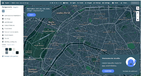 Estas funciones son similares en las tres bibliotecas (Leaflet, OpenLayers y Mapbox). Sin embargo, la biblioteca Mapbox contiene una biblioteca JS que proporciona una página web para ayudar al usuario a obtener herramientas adicionales para la creación de mapas web. Este sitio permite al usuario crear mapas web directamente y transferir el archivo a QGIS. La Figura 2 presenta un ejemplo de mapa web en el sitio web oficial de Mapbox.