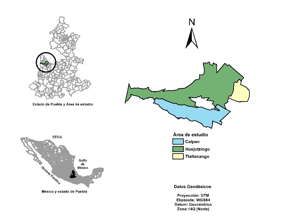 El área de estudio abarcó a tres municipios del estado de Puebla e integran la Microrregión de Atención Prioritaria de Huejotzingo (MAP) (Figura 1). En el municipio de Tlatenango se generó la experiencia, en el territorio Huejotzingo se escaló la experiencia generada y la municipalidad de Calpan se consideró como testigo para hacer un comparativo de los resultados. La MAP, de acuerdo con el Colegio de Postgraduados (2015), es conceptualizada como un “espacio geográfico donde convergen problemas sustantivos de carácter productivo, ambiental o social, y en donde los Campus del COLPOS, a través de sus académicos, definen áreas de influencia para realizar actividades de vinculación y transferencia tecnológica, de manera organizada, y sistematizada, retroalimentando las actividades de educación e investigación.