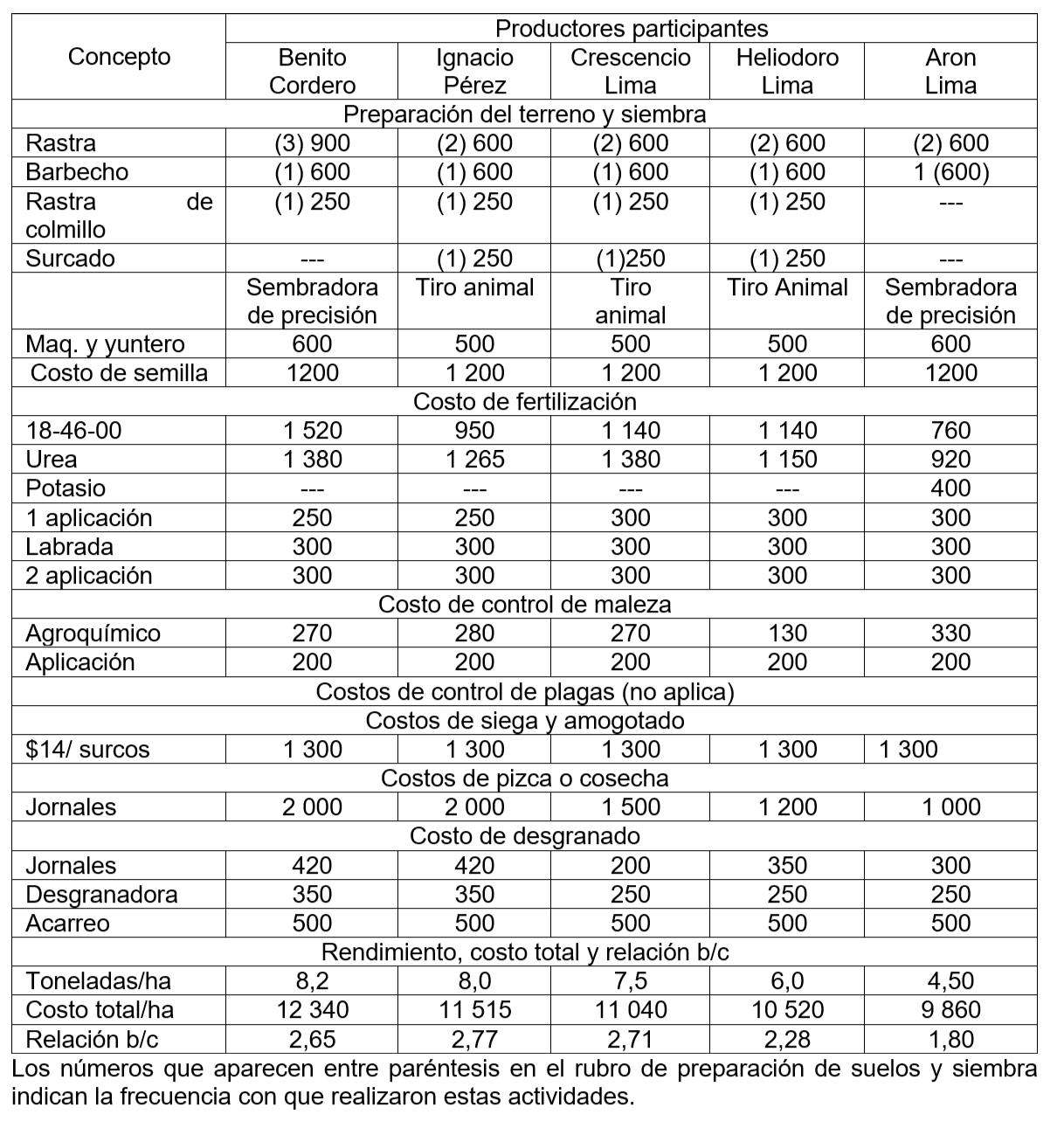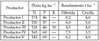 Fertilización: con base en la Tabla 1, se aprecia la relación entre los niveles de aplicación de fertilizantes, uso de semillas hibridas y rendimientos por hectárea. Los datos muestran una diferencia en algunos casos de más del 50% entre el volumen de grano producido con materiales mejorados que con materiales nativos.