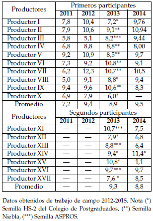 El Colegio de Postgraduados (CP)-Campus Puebla financió en este primer año la siembra de las 10 hectáreas. Con este recurso cada productor estableció una hectárea con fines demostrativos y el resto de la superficie que tienen bajo su control se financió por ellos mismos; en términos de porcentaje, el monto aportado por el CP representó el 30% de los costos de producción por hectárea, y el 70% restante se aportó por cada uno de los integrantes del grupo. En términos de financiamientos y como resultado del primer año, se generó un esquema para la producción de maíz que se operó en los siguientes años y que consistió en la aportación del 50% de la presidencia municipal y el otro 50% se cubriría por el grupo de acción. Bajo este esquema en este segundo año, se amplió la superficie a 147 ha aproximadamente y el grupo adquirió una sembradora de precisión. En el tercer año se amplió el programa a un mayor número de productores, en su mayoría jóvenes que después de su experiencia migratoria incursionaron nuevamente en las actividades agropecuarias. Fue muy interesante observar que el grupo de los primeros participantes estableció como requisito para los productores de nuevo ingreso el obtener un rendimiento mínimo de 6,0 t ha-1, para recibir el financiamiento de la presidencia municipal. En términos de rendimientos y con base a la Tabla 4, se observó que en el comportamiento en los niveles de producción de maíz durante el primer año (2011), los iniciadores del proyecto registraron un volumen de producción promedio de 7,24 t ha-1, nivel de producción que se sostiene durante el periodo de 2013-2014, también, hubo casos en el que algunos miembros del grupo obtuvieron rendimientos mayores a 10 t ha-1. Estos niveles de rendimientos superaron los niveles de producción de 2,2 hasta 3,7 t ha-1 planteado por la estrategia de Mas Agro, un programa nacional dirigido a homogenizar el nivel de producción de maíz en condiciones de temporal entre los pequeños productores (Turrent et al., 2017).
