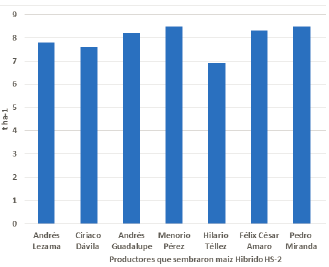 Los factores que determinaron la formación y participación del grupo de acción en el proyecto de maíz HS-2 fueron: 1) la participación del responsable del grupo de Santa Ana Xalmimilulco en el Consejo Municipal de Desarrollo Rural Sustentable de San Miguel Huejotzingo, 2) intercambio de experiencia sobre el uso de semillas hibridas con los productores de San Pedro Tlaltenango, y 3) participación de algunos integrantes del grupo en un proyecto piloto para introducir maíz hibrido HS-2 entre los productores. Estas acciones crearon las condiciones para que los productores participaran en la siembra de 100 ha del maíz hibrido HS-2 (Regalado et al., 2010). Los resultados de esta primera experiencia en Santa Ana Xalmimilulco corroboraron la posibilidad de elevar los niveles de rendimientos tanto de grano y forraje mediante la aplicación más precisa de los componentes tecnológicos, incluyendo el uso de esta semilla. Con base a los datos de rendimientos de los primeros integrantes que utilizaron esta semilla tal como se muestra en la Figura (2), se demostró que el uso de este material representaría una alternativa para obtener un mayor volumen de grano para abastecer a la unidad de producción y forraje verde para el ensilado y seco que se utiliza durante todo el año, en cantidad suficiente y de calidad para apoyar a la actividad ganadera, con el propósito de mantener o elevar la producción de leche que, según los propios productores, se estima en un volumen de 90 mil litros diarios.