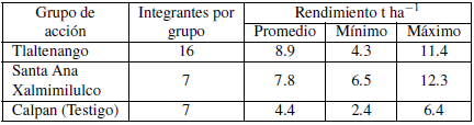 En San Pedro Tlaltenango, el grupo de acción se integró por productores de maíz que combinan la producción del grano con la ganadería. En San Ana Xalmimilulco el grupo se conformó como una Sociedad de Producción Rural (SPR), figura legal establecida para llevar a cabo procesos de producción, comercialización, entre otras actividades. Mientras que en San Andrés Calpan se identificaron a 7 productores individuales, en cuyas parcelas se realizaron estimaciones de rendimiento para conocer sus niveles de producción de maíz.