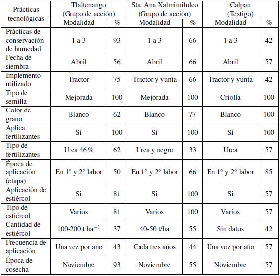 Estos grupos practican dos sistemas productivos relacionados con la producción de maíz. El primero consiste en un sistema basado en la producción de maíz en condiciones de secano que se combina con la producción de leche y carne; y el segundo en un sistema tradicional de maíz intercalado en árboles frutales. El primero prevalece más en el municipio de Tlaltenango, y en la localidad de Santa Ana Xamimilulco, mientras que el segundo se utiliza más en el municipio de Calpan. En ambas localidades se identificaron productores clave para dinamizar procesos para la formación de los grupos de acción; para el caso de Tlaltenango, uno de los líderes de la producción de maíz desempeñó este papel y en Santa Ana Xalmimiluco, el representante de la Sociedad de Producción Rural fue el representante del grupo; cada uno de estos productores asumió responsabilidades en sus localidades. Para el caso de Tlaltenango, el responsable tuvo el rol de presidente del Comité de Decisiones del Programa Intensivo para la Producción de Maíz, y en Santa Ana Xalmimilulco el responsable de grupo se ocupó de los cargos y actividades comunitarias.