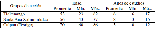 Con respecto a la edad, en Calpan se observó una mayor población adulta y con menor número de años de estudios, mientras que, en los dos grupos de acción, se notó mayor población joven; en este sentido se destaca el caso de un integrante que inmigró a los Estados Unidos de América y una vez retornado a Tlaltenango, incursionó en las actividades agropecuarias. Actualmente las familias de los y las integrantes de las tres localidades permanecen en la comunidad, realizando actividades hacia el interior y fuera de la unidad familiar.