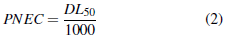 El impacto ambiental fue evaluado con los datos hallados del DL50 y PNEC (dosis sin efecto ecológico). El valor PNEC se encontró usando un factor de 1 000 para ensayos de periodos cortos. Para los plaguicidas con un Kow mayor a 2, el valor de su DL50 fue dividido por 2 como es propuesto en (European Commission, 2019) en base a la ecuación 2.