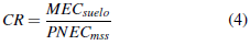 El CR se calculó usando la ecuación 4, y se clasificó en cuatro niveles: 1. Riesgo nulo (CR < 0,01), 2. Riesgo bajo (0,01 ≥ 0,1) 3. Riesgo medio (0,1 ≤ CR < 1) y riesgo alto (CR ≥ 1) siguiendo Sánchez-Bayo, Baskaran y Kennedy (2002). La suma de los CR de los tres plaguicidas permitió determinar el riesgo ambiental total por la aplicación de zetacipermetrina, profenofos y pendimetalina, y finalmente se cuantificó la contribución de cada uno de los tres plaguicidas.