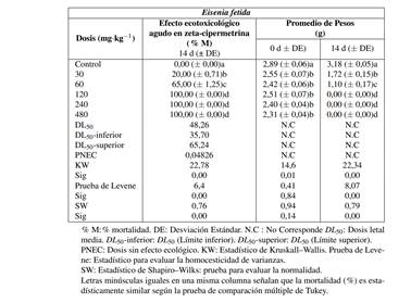En el estudio con E. fetida se observaron efectos en la mortalidad y disminución en el peso para zetacipermetrina (DL50 = 48,26 mg·kg−1). Resultados similares se hallaron en la base de datos de plaguicidas de República Checa (PPDB, 2019) donde figura un valor de DL50 = 37,50 mg · kg−1. Junquera (2011) menciona que la cipermetrina también es conocida como la zeta-cipermetrina, lo que permite que se contraste con otros estudios como, por ejemplo, el de Hartnik, Sverdrup y Jensen (2008) quienes obtuvieron un valor en alfa-cipermetrina de 762 g·kg−1 . Zhou y col. (2008) y Zhou y col. (2011) presentaron valores de 84,14 mg · kg−1 y 86,04 mg · kg−1 , respectivamente.