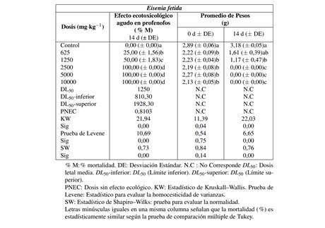 Todos los ensayos se realizaron con cuatro repeticiones y se ajustaron al 50% de humedad para las pruebas. Para validar la prueba, se consideró como principio que la mortalidad del control no superara el 10%. Para este ensayo se usó el protocolo de Avalos-Ruiz y Iannacone (2020), que consistió en medir los indicadores físicos y químicos como la temperatura, la humedad, el pH y la materia orgánica, así como la mortalidad para la determinación de la DL50 a los 14 días de exposición, y el promedio de pesos al inicio y al final de la prueba a los 14 días (Hulbert y col., 2020; Avalos-Ruiz y Iannacone, 2020). Todas las lombrices que no se encontraron en el instante fueron registradas como fallecidas, por lo que se decidió medir su progenie (huevos y crías juveniles) presentes en el suelo artificial, pero no se evidenció ninguno de ellos en los tratamientos de los tres pesticidas.