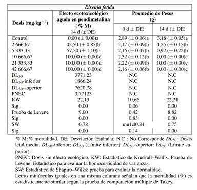 Se encontró la toxicidad aguda de la pendimetalina sobre E. fetida a los 14 d de exposición (Tabla 3). La DL50 a los 14 d de exposición fue de 3 771,23 mg·kg−1. Con respecto al promedio de pesos, se evidenció una reducción notable.