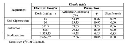 La Tabla 4 expresa el porcentaje de evasión de los tres plaguicidas a valores de 60%, 40% y 80% en las dosis de 30 mg·kg−1, 625 mg·kg−1 y 2 666,67 mg·kg−1, respectivamente. El análisis del Chi-cuadrado (χ2), indica que se encontró una conexión entre la evasión y la presencia del plaguicida para ambas dosis de zeta-cipermetrina, profenofos y pendimetalina, exceptuando la dosis de 312,5 mg·kg−1 de profenofos y 1 333,33 de pendimetalina.