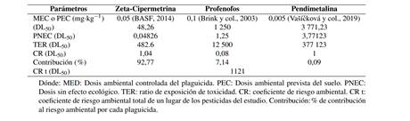 Se obtuvieron los valores del TER (Tabla 6), que fueron 482,6; 12 500 y 377 123 mg·kg−1. Por otro lado, los CR de cada plaguicida fueron 1,04; 0,08 y 0,001. Se demuestra que el CR t es mayor a 1, valorándolo como un impacto ambiental alto. La contribución de la zeta-cipermetrina fue de 92,77%, seguido del profenofos con un 7,14% y la pendimetalina con 0,09%.