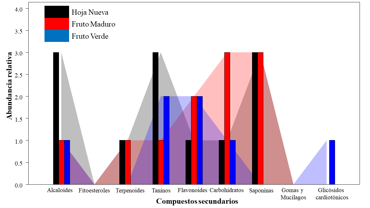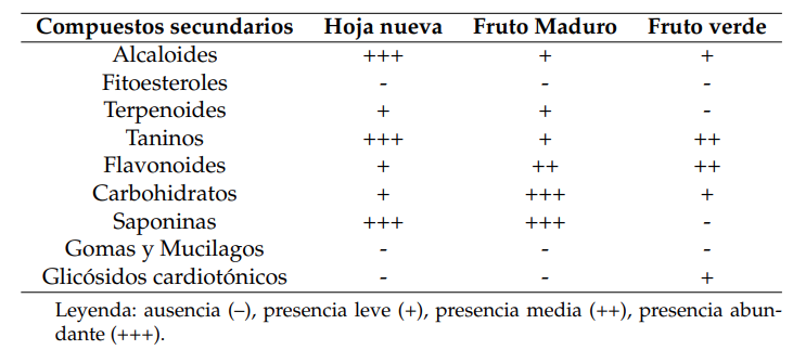 El índice de Whittaker mostró sólo un 23,53% de diferencia entre las partes de las plantas. La HN con el FM presentó los mismos grupos de compuestos secundarios. El FV con respecto a la HN y el FM presentó 27,27% de diferencia en la composición fitoquímica. El fruto verde presentó cinco grupos de compuestos secundarios, abarcando compuestos nitrogenados (alcaloides) y compuestos fenólicos (taninos y flavonoides). No se obtuvo presencia de terpenoides. En FM se logró la identificación de seis grupos pertenecientes a los tres grandes grupos principales. El FV presentó glicósidos cardiotónicos con mayor abundancia de taninos; sin embargo, el fruto maduro presentó terpenoides, con alta abundancia de carbohidratos y baja de taninos.