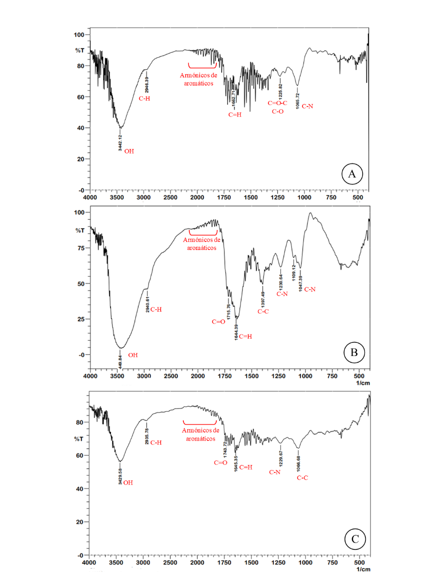 Las señales de FTIR para el extracto del FV de almendro (T. catappa L.) fueron de compuestos aromáticos (1770-2010 cm-1), OH de compuestos fenólicos (1066 cm-1) y C=O-C de éteres aromáticos (1229 cm-1), lo que indica una posible presencia de los grupos de ácidos polifenólicos, taninos gálicos, saponinas y flavonoides. En el caso de las HN, estas muestran tensiones de C-H (2946 cm-1) y C=H (1662 cm-1), que podrían ser posibles indicadores de cadenas de terpenoides o fitoesteroles. De igual forma, FM y FV presentan señales armónicas, indicativos de compuestos aromáticos (1770-2010 cm-1) en conjunto con señales de OH, indicativo de posibles compuestos fenólicos.