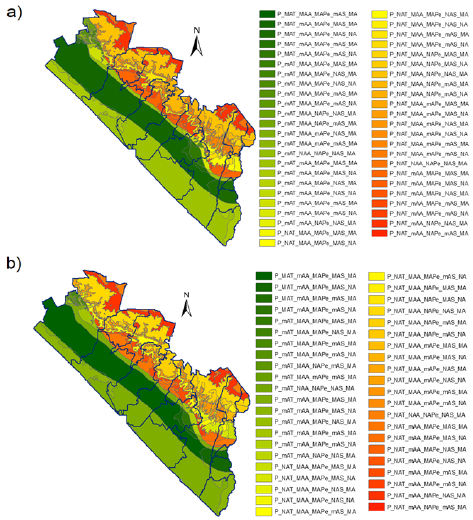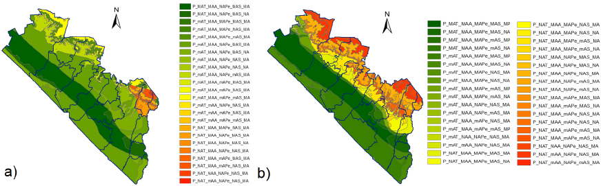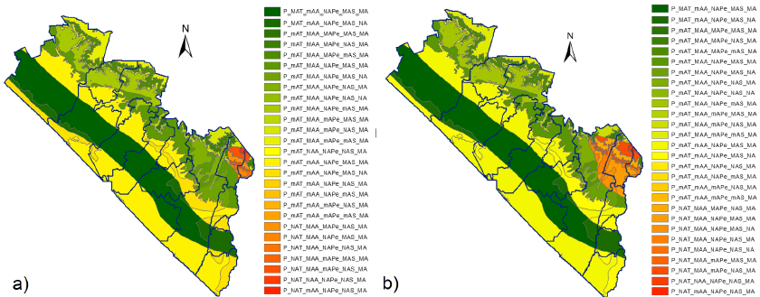 Los mapas de limitantes para ambos cultivos mostraron la variabilidad de unidades distintas, perfectamente identificables por las condiciones ambientales que tuvieron lugar en cada una de ellas, por lo que las combinaciones de colores empleadas no fueron jerárquicas ni exclusivas. Así mismo, cada una de las unidades fue descrita por una fórmula única. En el caso de la aptitud actual para el cultivo del café se presentaron 24 unidades diferentes, aunque las primeras siete abarcaron más del 75% de la superficie de la región. Por otro lado, la aptitud actual para el cacao presentó 36 clases distintas, de las cuales las primeras seis cubrieron más del 50% de la superficie total, Figura 5. La aptitud por limitantes es totalmente cualitativa y representa un complemento de lo obtenido en la ponderación, porque permite identificar la incidencia de cada una de las variables consideradas en la zonificación agroecológica. En la Figura 5a) y 5b) se puede apreciar que las áreas coloreadas en rojo están limitadas por un mayor número de variables y es posible identificarlas utilizando la nomenclatura descrita en la Tabla 3.
