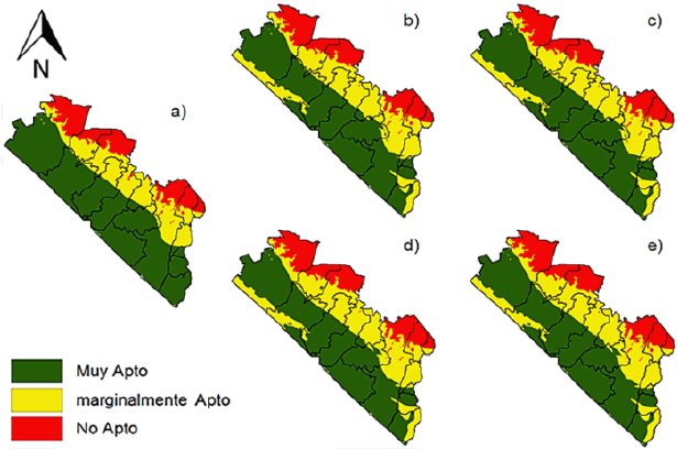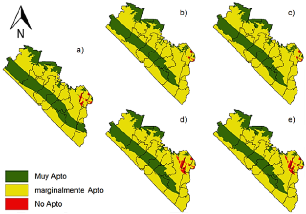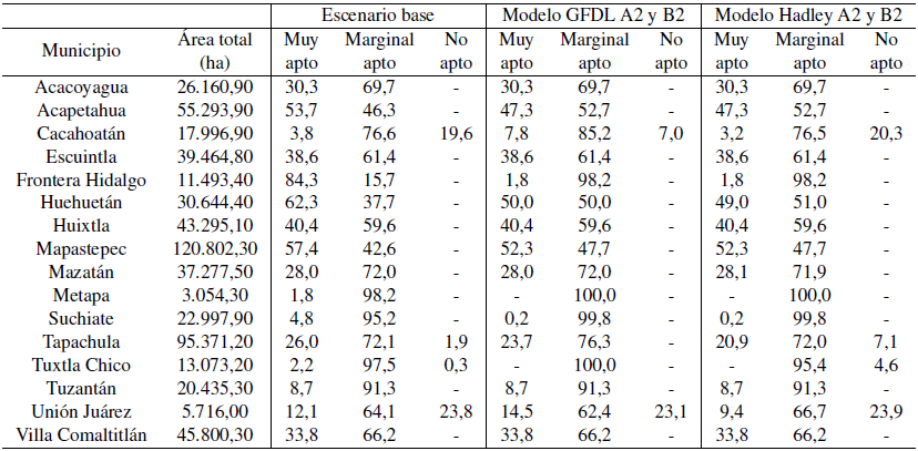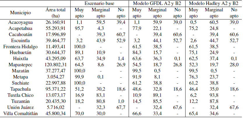 A nivel municipal, los cambios más importantes se presentaron en Acapetahua, Huehuetán, Mapastepec, Metapa, Suchiate, Tapachula y Frontera Hidalgo, este último con una reducción de aptitud de hasta 82,5% de su superficie. Sin embargo, el modelo GFDL proyectó pequeños cambios positivos como el incremento de aptitud de hasta un 4% en el municipio de Cacahoatán, Tabla 5.