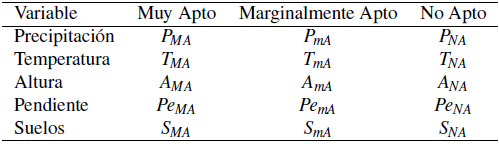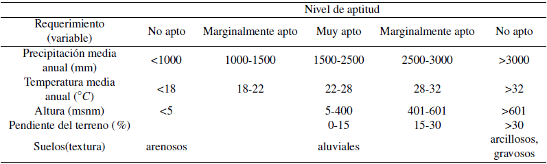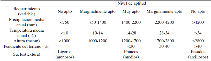 Se definieron los requerimientos edafoclimáticos que intervienen en el desarrollo y productividad de cada uno de los cultivos con la finalidad de asignar niveles de importancia a cada una de las variables a considerar. Se creó una tabla para cada cultivo con sus respectivos requerimientos y se clasificaron en diferentes niveles de aptitud: muy apto, marginalmente apto y no apto, utilizando como referencia los rangos inferiores y superiores de cada uno de los requerimientos que toleró cada cultivo (Tabla 1 y 2).