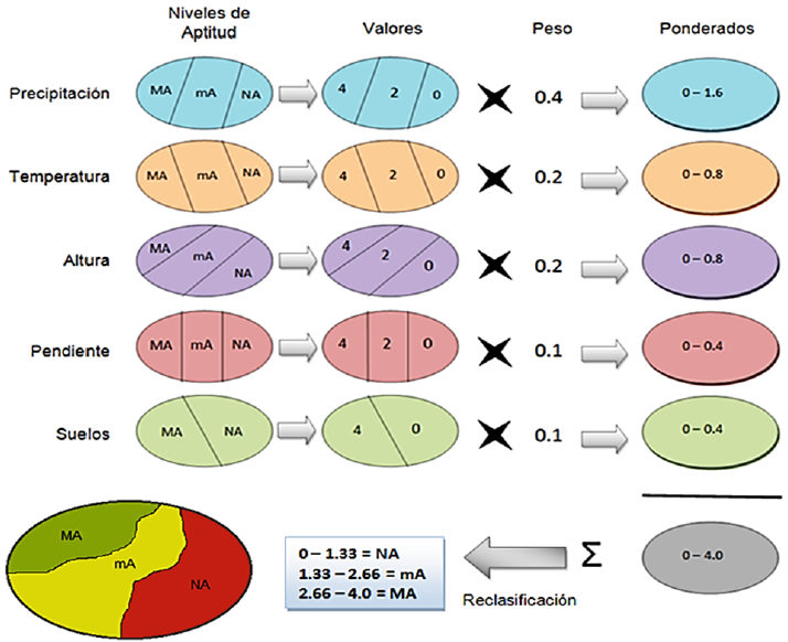 Con las claves asignadas, se procedió a realizar la sobreposición de capas con la finalidad de obtener un solo mapa que mostró todas las posibles combinaciones (celdas agroecológicas) entre niveles de aptitud de cada uno de los indicadores estudiados como se muestra en la Figura 2.