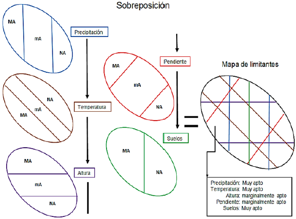 La zonificación por factores limitantes se realizó utilizando una sobreposición de capas con la herramienta Geoprocessing. Los mapas se reclasificaron de acuerdo a las tablas de requerimientos de los cultivos en sus diferentes niveles de aptitud. Para ello fue necesario asignarle claves a cada nivel de aptitud y generar una nomenclatura que permitió conocer con exactitud la incidencia de cada factor al sobreponer los mapas (Tabla 3).