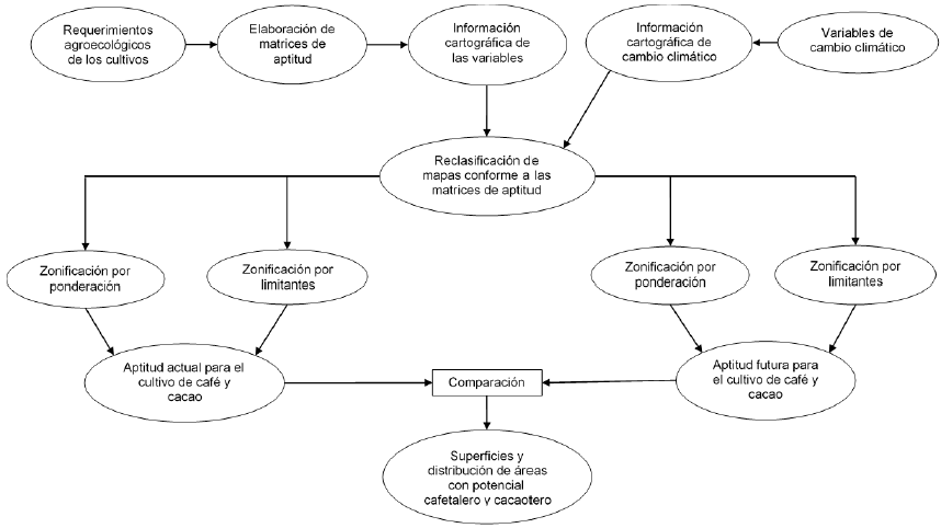 Estudios realizados sobre el incremento de la temperatura por efecto del cambio climático muestran que el cultivo del café sufrirá una importante redistribución geográfica en México y en otros países productores (Paes, 2010; Haggar y Schepp, 2012; Ovalle-Rivera y col., 2015); en este sentido, son pocos los estudios sobre el cacaotal; sin embargo, el panorama no es distinto. Sobre la ponderación de factores y factores limitantes para la producción agrícola, la zonificación agroecológica es una herramienta práctica que define zonas a través de la combinación de características similares de clima, suelo y potencial biofísico para la producción agrícola. Esta combinación se traduce en zonas con limitaciones y potencialidades, lo que permite ser una referencia para recomendaciones que permitan mejorar la situación existente, incrementando la producción o la superficie del cultivo, o limitar la degradación de los recursos naturales (Suárez-Venero y col., 2019).