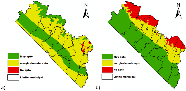 De igual forma, los cambios más significativos en escala municipal se encontraron reflejados en Acapetahua, Huehuetán, Mapastepec, Metapa, Tapachula, Tuxtla Chico, Tuzantán, Villa Comaltitlán, Frontera Hidalgo y Suchiate, estos dos últimos con una reducción de aptitud de hasta 38% de su superficie. En este caso, no se apreciaron cambios positivos en la aptitud para ninguno de los dos modelos, Tabla 6.