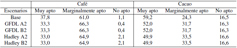 Para el cultivo de café y cacao, el modelo GFDL predice en las áreas con muy alto potencial una reducción de 4,5 y 7,2%, y en las de potencial marginal un aumento de 5,3 y 7,4%, mientras que las áreas sin potencial presentan una disminución de 0,7 y 0,2%, respectivamente; este último caso representa un impacto positivo del cambio climático, aun cuando es menor que el producido en las zonas con muy alto potencial. Con respecto al modelo Hadley, éste pronostica para café y cacao en las áreas con muy alto potencial una reducción de la superficie del 4,8 y 9,3%, y en las áreas de potencial marginal un incremento de 3,9 y 9,2% y en las áreas sin potencial un incrementó de 1,0% y una disminución de 0,1%, respectivamente.