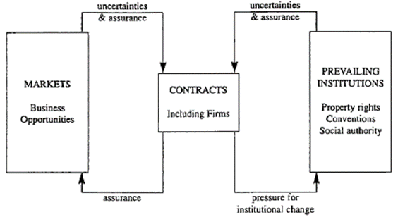 Frente a estos problemas y limitaciones que presenta la teoría de la organización industrial, se ha planteado que un correcto análisis del funcionamiento de la AC pasa por comprender que esta debe estudiarse desde un «contexto teórico más amplio», es decir, más allá de las dinámicas económicas de funcionamiento del sector agrario, entendiendo que la subcontratación de procesos productivos específicos abarca un abanico amplio de industrias y sectores —primarios, secundarios o terciarios—. Y, por lo tanto, comprendiendo también aspectos como «por ejemplo las decisiones relativas a fabricar o comprar, los costes de transacción, las fallas del mercado y todas las consideraciones de riesgos que normalmente toman en cuenta los agentes económicos» (Runsten y Nigel, 1996, p. 2). En este sentido, en el seno de la nueva economía institucional o neoinstitucionalismo se recuperan las teorías fundamentales que se presentan a continuación: «los costes de transacción» —siendo Coase (1937), Coase (1960) y Bartra (1994) y Williamson (1979), Williamson (1985) y Williamson (1988) sus máximos representantes—; «la teoría de la Agencia» —Jensen y Meckling (1976) son sus más destacados exponentes—; y, la teoría de los «derechos de propiedad» —Alchian y Demsetz (1972)— (Iglesias, 2000).