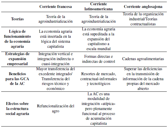A lo largo de estos apartados se han analizado los principales estudios y aportaciones procedentes de distintas escuelas que se han considerado relevantes para los factores que han contribuido de forma decisiva en el desarrollo de la modalidad productiva y comercial del contrato en la agricultura, especialmente desde la perspectiva de las GCA. Entonces, en el transcurso de la investigación se han expuesto las aportaciones de tres corrientes diferentes: i) la corriente francesa; ii) la corriente anglosajona; y, iii) la corriente latinoamericana. A continuación, se exploran los puntos de divergencia y confluencia entre estas corrientes (Tabla 1).