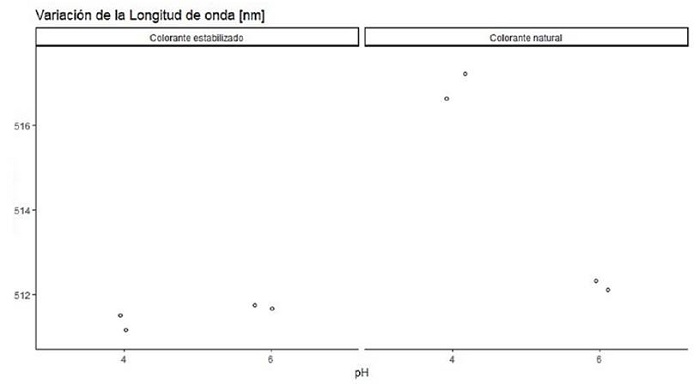 El extracto seco al estar expuesto a una variación de pH de 4 y 6, presenta cambios en la longitud de onda máxima. Estos desplazamientos son producidos por Malvidina -3- glucósido presente en el pigmento. El análisis ANCOVA determinó que la variación de pH en el colorante natural produce variaciones significativas (Valor ˗p < 0,05), con un intervalo de confianza del 95%.