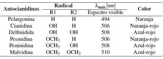 Las antocianinas de origen vegetal son colorantes naturales, (Yépez y Suárez, 2019) con propiedades protectoras para las plantas frente a: luz UV, oxidantes y radicales libres (Enaru y col., 2021). Su utilidad en la industria cosmética, alimenticia y farmacéutica se ha incrementado por sus propiedades bioactivas (Buchweitz y col., 2013) dentro de las cuales se encuentran: efectos antidiabéticos, antitumorales, antiinflamatorios y anticancerígenos (Garzón, 2008). Además, son los ejecutores de la gama de colores que comprende del rojo al azul de varios frutos (Nguyen y col., 2018). Una de las razones de estas amplias tonalidades es la estructura del anillo B presente en la estructura de Malvidina 3-O-Glucósido (Sánchez, 2013)). Este anillo presenta variaciones en sus radicales (Tabla 1), en las cuales se pueden diferenciar mayor metoxilación con desplazamientos hacia coloraciones azules, por otro lado, menor número de metoxilaciones con tonalidades rojas (Rahman y col., 2021).