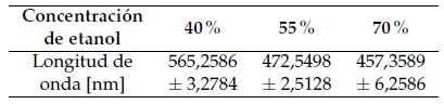 En la Tabla 2 se observan los máximos de absorción de Malvidina con su respectiva desviación estándar, evidenciando un efecto solvatocrómico a diferentes concentraciones de solvente.