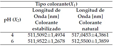 La Tabla 3 presenta longitudes de onda máximas de malvidina en: colorante natural y estabilizado en pectina cuando existe una variación de pH en agua. El análisis ANCOVA determinó que el pH del colorante natural es significativo (Valor-p < 0;05), con un intervalo de confianza del 95%. El pigmento al estar expuesto a una variación de pH de 4 y 6 presenta cambios en la longitud de onda máxima. Estos desplazamientos son producidos por Malvidina -3-glucósido presente en el extracto seco.
