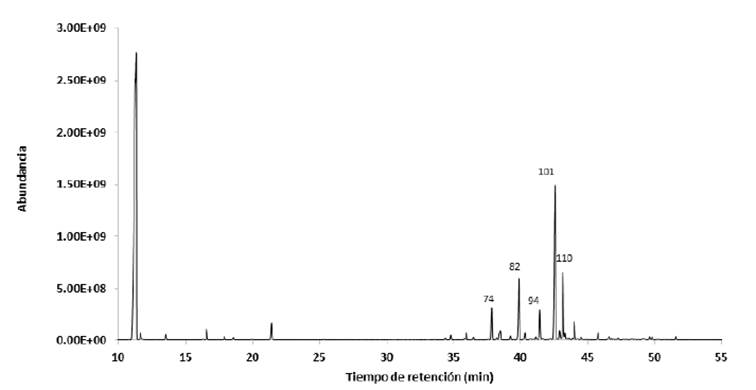 La cuantificación de los compuestos se realizó con el detector FID, conforme al método propuesto por Tissot y col. (2012). Para ello se calculó el factor de respuesta relativo (FRR) de cada compuesto respecto al caproato de isopropilo que se empleó como estándar de cuantificación. Los FRR se basaron en las entalpías de combustión y se determinaron con la fórmula descrita por Tissot y col. (2012). Se usó el nonano como estándar interno y el caproato de isopropilo como estándar de calibración. Se realizó la inyección de cuatro repeticiones por muestra de AE y de seis estándares con las mismas condiciones cromatográficas. Estos estándares se prepararon pesando cantidades constantes de nonano (7,13 mg) y cantidades crecientes de caproato de isopropilo (0,6; 1,4; 4,2; 8,3; 16,4 y 33,6 mg) aforando con ciclohexano. La curva presentó un R2 de 0,9998 y la ecuación obtenida nos permitió obtener los miligramos de cada compuesto. Se consideró un límite de detección de 0,1%, calculando los porcentajes de cada componente en relación a la masa total de AE. Se calculó la media y desviación estándar para cada compuesto.