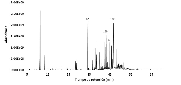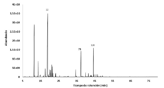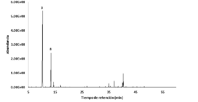 En el aceite esencial de P. macrotrichum se determinaron 66 compuestos correspondientes al 98,71%. Se encontró como compuestos mayoritarios al δ-3-careno (58,21%), eugenol (9,75%) y acetato de chavibetol (7,81%), evidenciándose mayor cantidad de hidrocarburos monoterpenos en un 73,92% del total. Los compuestos identificados se describen en la Tabla 1 y se pueden observar en el cromatograma de la Figura 2.