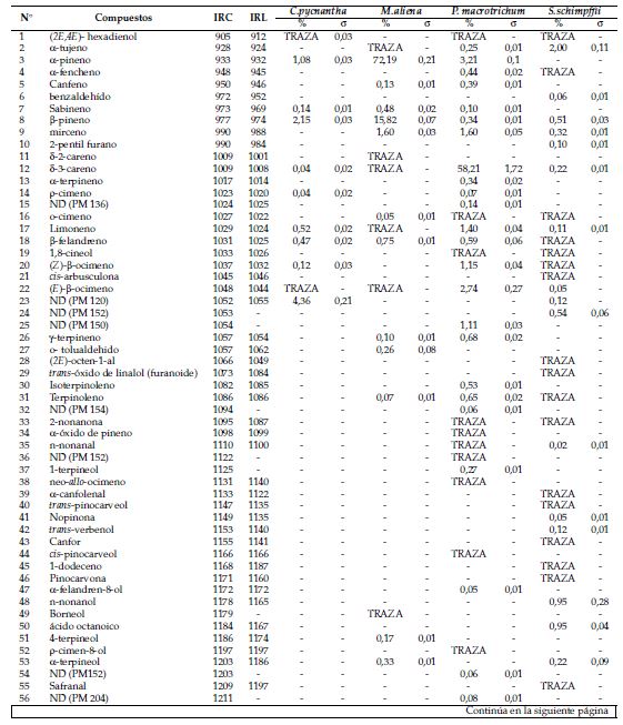 En el aceite esencial de M. aliena se identificó un total de 43 compuestos, lo cual representa el 98,92%, siendo los compuestos mayoritarios dos monoterpenos α-pineno (72,19%) y β-pineno (15,82%). Los compuestos se pueden visualizar en el cromatograma de la Figura 3 y se detallan en la Tabla 1.