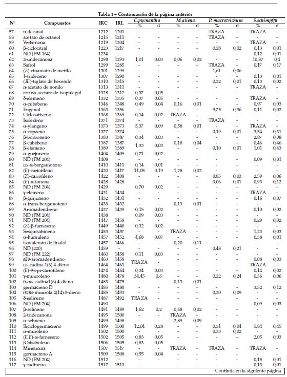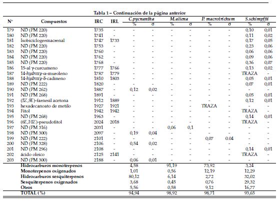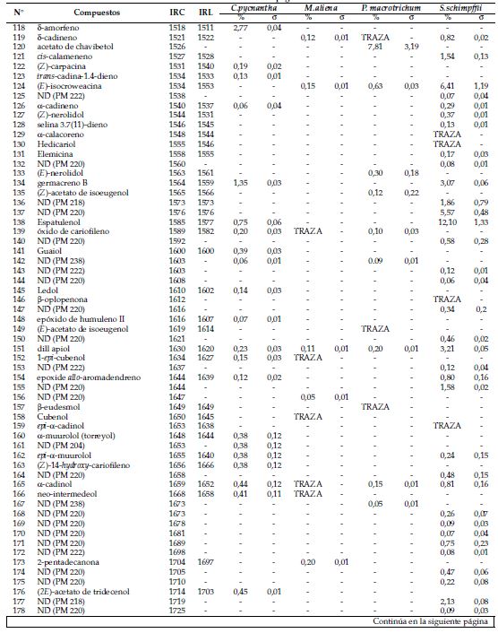 Las inyecciones en GC-FID se realizaron con las siguientes condiciones: temperatura del inyector de 230 °C, modo de inyección split, con radio de split 10 para P. macrotrichum y 40 para C. pycnantha, S. schimpffii y M. aliena, siendo el volumen de inyección 1 μL; columna DB-5ms con flujo de 1 mL/min; programa térmico: temperatura del horno 50 °C durante 10 minutos y rampa de temperatura de 2 °C/min hasta 170 °C y 10 °C/min hasta 230 °C durante 10 minutos. El tiempo total de corrida fue de 83 minutos. La temperatura del detector fue de 230 °C.