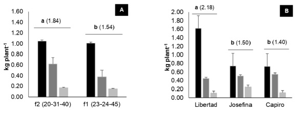 En cuanto al rendimiento de los tubérculos, el peso por categoría presentó los siguientes valores medios: f1: 1,54 y f2: 1,84 kg plant a −1 . Las formulaciones f1:1,05 en la primera categoría; 0,62 en la segunda categoría y 0,17 kg planta-1 en la tercera categoría; mientras que los fertilizantes f2 obtuvieron rendimientos por categoría de 1,01 en la primera categoría; 0,38 en la segunda categoría y 0,15 kg plant a −1 en la tercera categoría. La diferencia en los tubérculos de segunda categoría se refleja en los valores estadísticos significativos (Figura 1A). El INIAP Libertad presentó la mejor respuesta con 2,18, seguido por el INIAP Josefina con 1,51, y el DIACOL Capiro con 1,39 kg plant a −1 (Figura 1B).