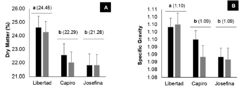 La variedad INIAP Libertad presentó los mayores porcentajes de MS con una media de 24,45%. Las variedades Capiro e INIAP Josefina son estadísticamente similares, con un contenido de MS de 22,29 y 21,82%, respectivamente (Figura 2A). La prueba de Tukey para la interacción (α = 0,05) presentó tres rangos de significancia. El tratamiento f1v1 presentó el mayor contenido de MS, con una media de 25,17%. El tratamiento f1v2 presentó el menor contenido de MS, con una media de 21,50%.