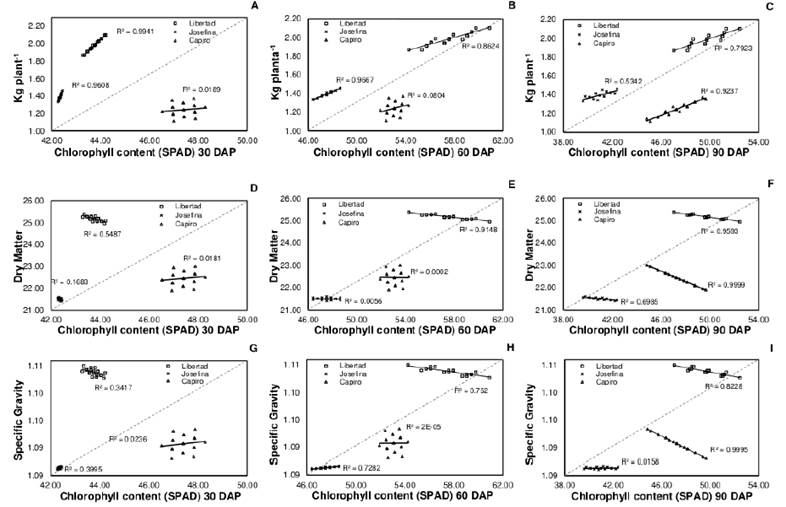 Se observaron efectos dependientes entre otras variables en los estratos superiores de la planta (Fig. 3-4). La correlación de los análisis de rendimiento (kg planta-1) fueron mayores (p < 0,01) a 90 DAP, independientemente de la altura de planta. Se observaron diferencias significativas en la variedad y formulación INIAP Libertad (KNO3 + NH4H2PO4+ KCl), en diferentes etapas del cultivo, en diferentes funciones de modelado matemático, correlaciones entre CCF (valor SPAD), como x, en el peso de tubérculos (kg plant a −1 ); MS, SG, GC (datos 20 DAH), como y; las correlaciones cambian con un ajuste diferente para el modelo (Tabla 2). Para W (kg plant a −1 ), la mayor correlación se presentó en función del modelo diferente. A 30 DAP de función de modelo lineal con y = 0.262x - 9.460 (R2 = 0.9938); a 60 DAP de función de modelo de potencia con y = 10-1,57 x1,06 (R2 = 0.8553) y función de modelo de índice DAP 90 con y = 0.664 e0,02x (R2 = 0.7924).
