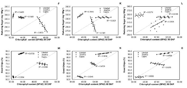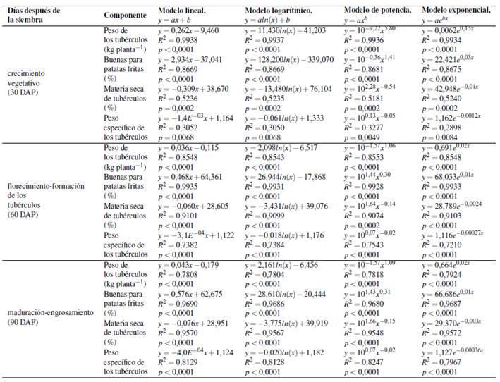 El análisis de regresión presentó un modelo de función matemático óptimo de correlaciones entre el valor de SPAD con el rendimiento y la calidad de los tubérculos basado en el valor del coeficiente de R2. Las investigaciones previas reportan una regresión matemática simple. El modelo lineal en su mayoría se utiliza para realizar análisis de regresión de relaciones entre valores SPAD y rendimiento (Netto y col., 2005; León y col., 2007; Hawkins, Gardiner y Comer, 2009). Uddling y col. (2007), determinaron que las relaciones en papa fueron no lineales con una pendiente creciente con mayores unidades SPAD. Las relaciones de la papa fueron comparativamente bajas (R2 = 0,5).
