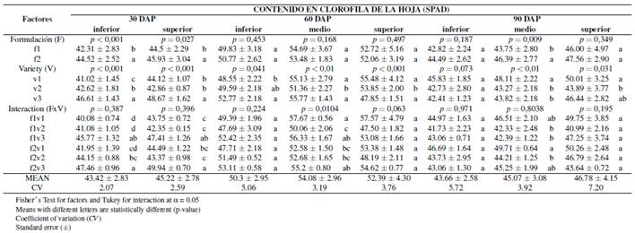 En la Tabla 1 se pueden observar las relaciones entre la edad fenológica del cultivo y la LCC (SPAD-502 plus®). Hubo un aumento en la edad fenológica, y los valores de SPAD mostraron una tendencia en el incremento cuadrático. El valor de SPAD fue constante e incremental en hojas de los tres estratos evaluados hasta un DAP de 60, independiente de la variedad y formulación edáfica. Se observó un efecto altamente significativo (p < 0,01) en las formulaciones de fertilizante edáfico con CCF en 30 DAP en los estratos inferiores de la planta y efecto significativo (p < 0,05) a 90 DAP en los estratos medios; es decir, durante las etapas de desarrollo vegetativo y el engrosamiento del tubérculo. Se observaron diferencias significativas entre las variedades de papa y CCF a los 30 y 60 DAP en todos los estratos, y a los 90 DAP, solo en los estratos medios de las plantas. Se encontraron diferencias significativas en el CCF en la interacción (FxV) en hojas a 60 DAP en el estrato medio de las plantas (Tabla 1). La prueba de Tukey α= 0,05 presentó tres rangos de significación. El tratamiento con f1v1 mantuvo los valores más altos, mientras que el tratamiento con f1v2 presentó los contenidos más bajos de clorofila.